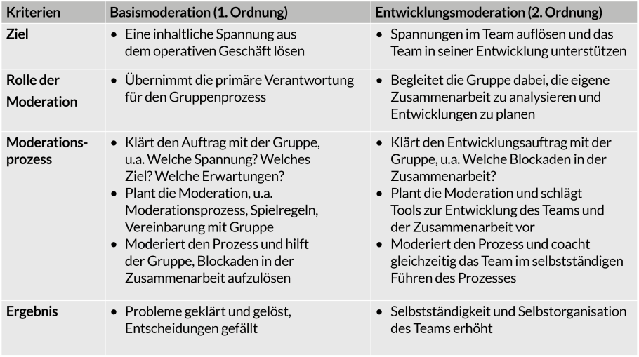 - Führung 2. Ordnung: Beobachtung und Steuerung der Zusammenarbeit als Vehikel für die Problemlösung (Zusammenarbeit selbst ist im Fokus) → Entwicklungsmoderation.