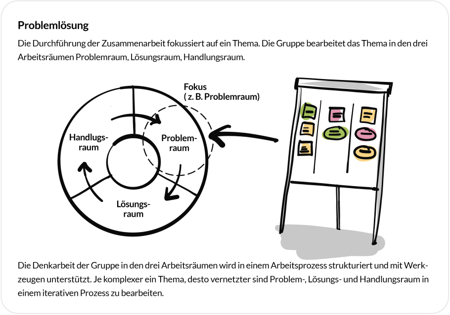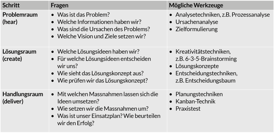 Die drei Schritte Problemraum, Lösungsraum und Handlungsraum können folgendermassen charakterisiert werden:
