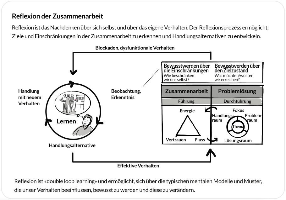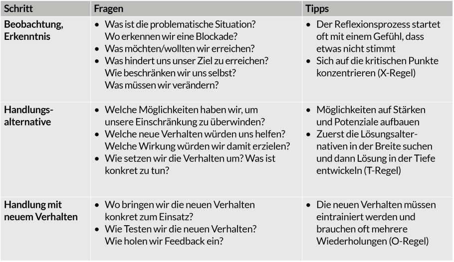 Reflexion bedeutet prüfendes und vergleichendes Nachdenken über sich selbst oder das eigene Verhalten. In der Systemtheorie Niklas Luhmanns bezeichnet Reflexion die Selbstreferenz sozialer Systeme, bei der das System seinen Operationen die Differenz von System und Umwelt zugrunde legt. Im Kern geht es um die Frage: «Was müssen wir an unseren typischen Verhaltens- und Denkweisen ändern, um den Zielzustand zu erreichen?»