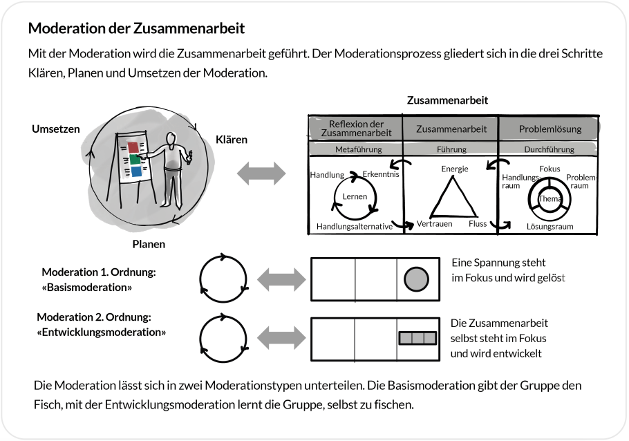 Moderation kommt von lat. Moderare (= mässigen) und ist die Führung der Zusammenarbeit über alle drei Führungsbereiche Durchführung, Führung und Metaführung hinweg. Es werden zwei Stufen der Führung unterschieden, welche zu zwei Grundformen von Moderation führen: